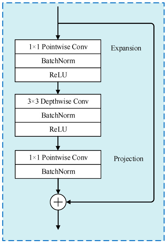 The DeepLabV3+ network usually uses Xpection as the backbone network, which leads to the disadvantages of complex network structure, a large number of parameters, long training times, etc. MobileNetV2 is a lightweight convolutional neural network proposed by Google for mobile devices or embedded systems, which has the advantages of small numbers of parameters, fast speed, and moderate depth [53]; its structure is shown in Figure 5. MobileNetV2 has three important structures: depthwise separable convolution, inverted residuals, and a linear bottleneck. Among them, depthwise separable convolution reduces computation by splitting the convolution operation into two steps, depthwise convolution and pointwise convolution, which reduce computation by several times compared to the standard convolution operation with the same number of weights [54]; inverted residuals reduce computation using 1 × 1 convolution before the 3 × 3 convolutional layer, and then after the 3 × 3 convolution layer, the 1 × 1 convolution is used for dimensionality reduction, which allows the network to perform feature expansion and then feature compression; the linear bottleneck structure avoids the activation function from destroying the features, i.e., instead of using the activation function layer for dimensionality reduction, and performs the addition of the residual network directly. MobileNetV2 can provide better feature compression and feature expansion in a lightweight way. At the same time, it can provide better feature representation capability and computational efficiency, so it is often used as the backbone feature extraction network of semantic segmentation models to reduce the number of total parameters of the models and improve their training speeds [55]. Therefore, MobileNetV2 was selected to replace Xpection as the backbone feature extraction network in this research.