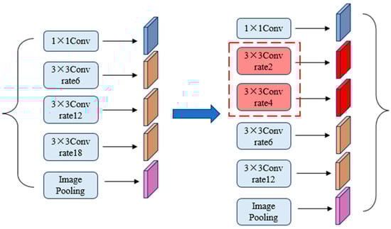 Urban vegetation cover is characterized by irregular edges, complex shapes, different sizes, scattered distributions, etc. [56]. The ASPP used by DeepLabV3+ in the encoder can effectively integrate the contextual semantic information learned by the model, but a hollow convolution rate of 6, 12, 18 is usually used in the ASPP due to the higher spatial resolution of the urban images acquired by UAVs and the clearer boundaries of the features. The overly large cavity rate will lead to the phenomenon that the convolution kernel produces a loss in detail information when performing the operation, and thus the segmentation effect of the boundary becomes worse [57]. Therefore, in this study, the structure of ASPP is adjusted, as shown in Figure 6. Two 3 × 3 convolutions with void rates of 2 and 4 are added before the convolution with a void rate of 6, and the convolution with a void rate of 18 is removed, which improves the segmentation ability of the model under high-resolution features.