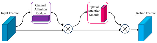 CBAM (convolutional block attention module) is an attention mechanism module used in deep learning to enhance the attention of convolutional neural networks to important features, and its structure is shown in Figure 7. The CBAM consists of two sub-modules, namely the channel attention module and spatial attention module. Among them, the channel attention module aims to capture the relationships between different channels and weight the features of each channel to better focus on the important channels in the task, while the spatial attention module aims to capture the relationships between different locations in the feature map to better focus on important spatial regions, which helps the module to better focus on spatially influential regions in the task [58]. The CBAM is designed to capture the relationships between different channels and weight the features of each channel by combining the outputs of the channel and spatial attention module’s outputs for element-by-element multiplication, thus allowing for attention to both the relationships between channels and important spatial regions in the feature map. This combined attention mechanism helps to improve the network’s ability to perceive important features, thus improving the performance of the model [59]. Therefore, in this research, the CBAM was embedded into the decoding stage of DeepLabV3+ to pay attention to vegetation features from both the spatial and channel dimensions, which strengthens the ability to filter non-vegetation features and enhances the feature extraction ability of the model, improving its classification accuracy.