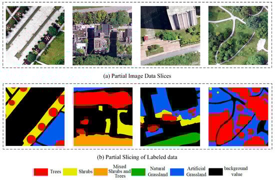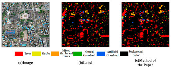 The vector label data used in the experiments were all constructed using visual interpretation, i.e., combining the UAV remote sensing image data to classify the vegetation in the training area into five categories, trees, shrubs, mixed trees and shrubs, natural grassland, and artificial grassland, and fully categorizing the non-vegetation features as background values, such as buildings, roads, and water bodies.