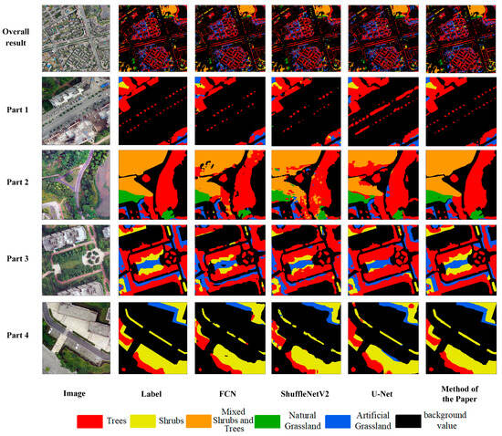 Table 4 shows an accuracy evaluation for the urban vegetation classification results of the four methods. As can be seen from the table, FCN performs the worst among the four methods, and U-Net performs slightly better than FCN and ShuffleNetV2. This is because the network structure of FCN is relatively simple, and the extraction of features and integration of the global ability are poor; meanwhile, U-Net has stronger feature extraction and global integration ability, but requires more memory and computational resources when using high-resolution drone images, and the corresponding model training time is the longest and more likely to overfit. With computational resources, the corresponding model takes the longest time to train and is more prone to overfitting. In addition, in terms of the overall accuracy (OA), the OA of ShuffleNetV2 is only 0.28% lower than that of U-Net, but its MarcoF1 and MIOU are 7.19% and 6.53% lower than that of U-Net, respectively, which indicates that the segmentation effect of U-Net will be better in the case of small differences between the two in the overall accuracy. ShuffleNetV2 is a classical lightweight network, and its advantage is that the number of parameters is small and the training time is short; however, the disadvantage is obvious, which is the learning degree of the features is insufficient, so that the stability of the model and its edge segmentation accuracy are poor in the vegetation classification task. The method in this paper is better than other methods in all indicators, from the comprehensive indicators; the OA, MarcoF1, and MIOU are 3.68%, 4.81%, and 8.46% higher than U-Net, respectively, which is the most effective among all of the methods. Secondly, the training duration of the model is the shortest, and it is also 0.31 h faster compared to the lightweight network ShuffleNetV2. This is because for this study’s method, the depth-separable convolution used in the backbone network MobileNetV2 reduces the number of parameters, while the channel attention mechanism in the CBAM enhances attention to important features and improves the efficiency of feature capture; the combination of the two improves the operational efficiency of the model. In addition, from the perspective of IOU indices of five vegetation categories, the segmentation trend of the four methods is the same, i.e., the segmentation accuracy in descending order is trees > mixed trees and shrubs > natural grassland > artificial grassland > shrubs, with this study’s method still showing the best performance, achieving 91.83% and 90.22% of the IOU value of the trees and mixed trees and shrubs, respectively. It shows that the method of this paper has the best accuracy, both in terms of comprehensive indices and various types of vegetation segmentation indices.
