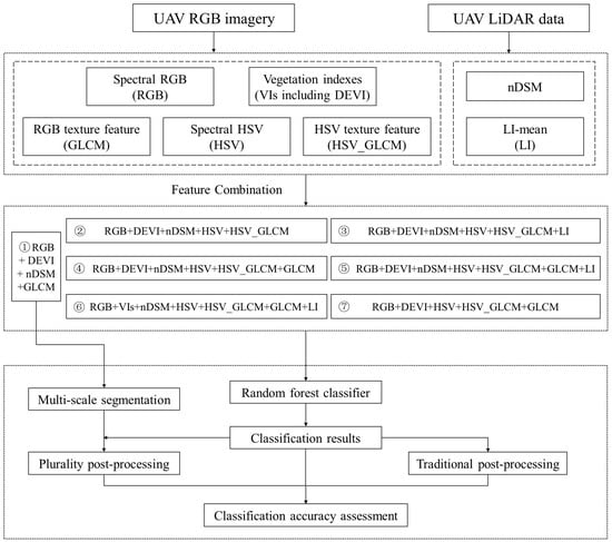In this study, seven distinct features of urban tree canopies were extracted from RGB imagery and LiDAR data collected by UAV. Various experiments were applied using the Random Forest classifier, followed by post-processing through the Plurality Filling method. The specific objectives of this research were as follows: (1) to assess the integrated application of UAV-based RGB imagery and LiDAR data for urban tree species classification; (2) to identify the optimal combination of features suitable for classifying urban tree species and assess the impact of different features on the accuracy of tree species classification; (3) to validate the effectiveness of the filling method in enhancing classification accuracy.