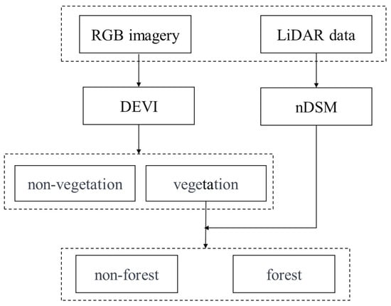 In urban environments, tree classification is difficult due to the effect of buildings and vehicles. To solve this problem, we implemented a strategy where the 2D spatial extent of trees was extracted before tree species classification (Figure 4). Trees were processed individually before feature extraction and classification. This proactive approach significantly reduced computational complexity, enhancing overall classification efficiency [45]. Specifically, UAV-based RGB imagery was utilized to compute the Difference Exponential Vegetation Index (DEVI). By employing the bimodal histogram thresholding method on the DEVI, the study area’s vegetation was effectively distinguished from non-vegetation. Subsequently, utilizing the nDSM data, the vegetated area was partitioned into sections below and above 2 m. Regions below 2 m were identified as non-forest, while those above 2 m were categorized as forest. These rules above extracted trees accurately which could establish a robust foundation for subsequent feature extraction and classification.