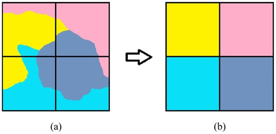 Schematic diagram of the Plurality Filling method. (a) Original image before filling; (b) Populated image after filling. The square grid in the figure represents the segmented object, and different colors represent the classification results of different types of cells.