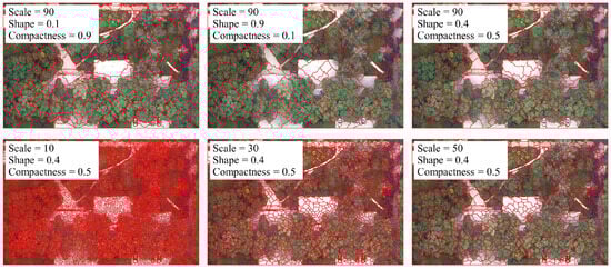 To apply Plurality Filling as a post-processing step for classification, it is crucial to obtain segmented tree results at first. This study utilized the multi-resolution segmentation algorithm for image segmentation. Several experiments were conducted with different segmentation scales, shape factors, and compactness factors. Figure 8 illustrates the results in the topical study area under various segmentation experiments. In this study, the final adopted experiment utilized a segmentation scale of 30, a shape factor of 0.4, and a compactness factor of 0.5. This outcome ensures the purity of objects through the method of over-segmentation applied to the image. This over-segmentation method guarantees the integrity of individual objects and lays the foundation for the subsequent Plurality Filling process.