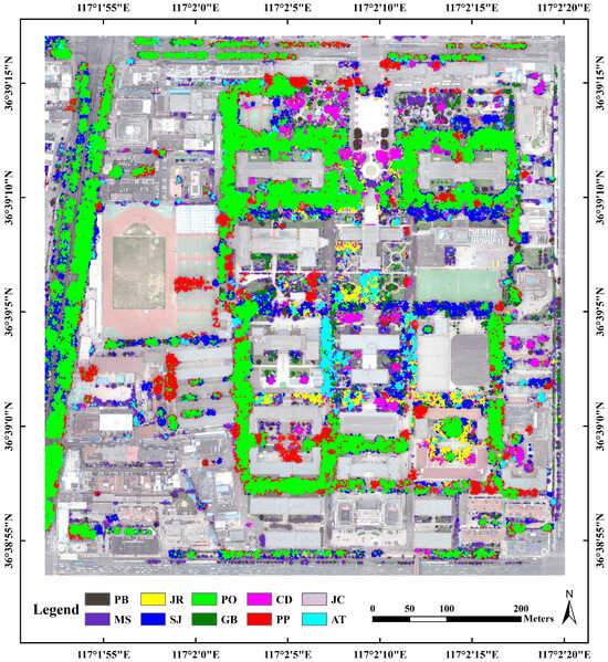 The tree species found in the study area are primarily deciduous trees, including Platanus orientalis (PO), Styphnolobium japonicum (SJ), Gingo biloba (GB), Acer truncatum (AT), Populus przewalskii (PP), Malus spectabilis (MS), and Juglans regia (JR). Additionally, there are also evergreen trees such as Cedrus deodara (CD), Juniperus chinensis (JC), and Pinus bungeana (PB). These tree species are intermingled and densely distributed, resulting in a high canopy density in the study area. In this study, 10 dominant tree species were selected as experimental subjects. Figure 2 displays the digital images and LiDAR point cloud cross-sections of these tree species.