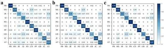Confusion matrix. (a) original result of the optimal scheme; (b) post-window sliding result of the optimal scheme; (c) plurality post-processing result of the optimal scheme.