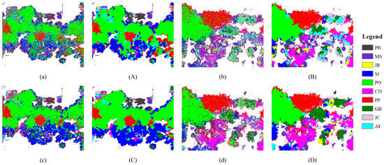 Details of classification results before and after post-processing. (a,b) are the results of Experiment 1; (A,B) are the post-processing results of Experiment 1; (c,d) are the results of Experiment 5; (C,D) are the post-processing results of Experiment 5.