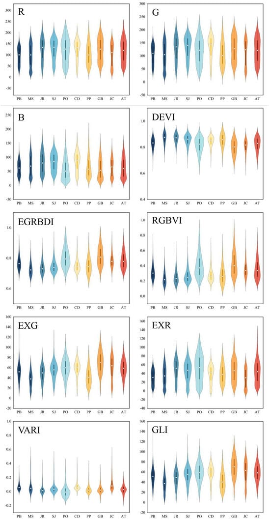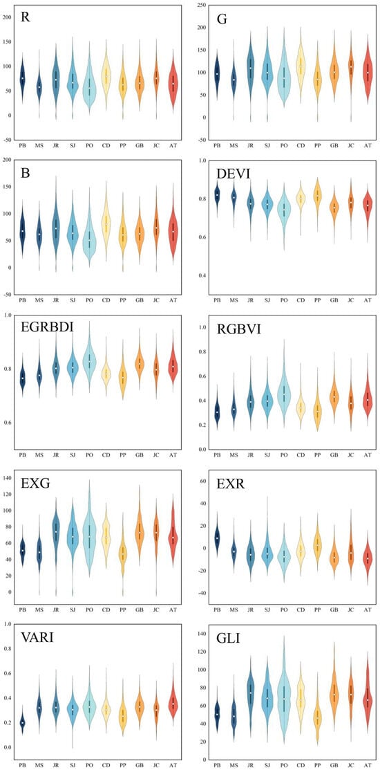 The RGB-LiDAR fusion data and the Plurality Filling post-processing method have verified their excellent performance in improving the overall accuracy of urban tree species classification, especially in the areas with high canopy density urban trees. To validate their performances, comparative experiments in October were also conducted. The results revealed that the trend of overall accuracy variations was roughly similar in both July and October. The utilization of only RGB data yielded the lowest classification accuracy (OA = 47.70%, Kappa = 0.40). However, the incorporation of LiDAR features has increased the overall accuracy by 19.64%, with a Kappa coefficient improvement of 0.23. Consistent with the results in July, this confirms the effectiveness of integrating UAV-based RGB and LiDAR data in urban tree species classification. The primary distinction between the two months was the significantly higher improvement in accuracy for October when additional vegetation indices were added. Possible reasons may be the larger color variations exhibited by trees during the fall which make the vegetation indexes much more effective [60]. In contrast, trees are in their most vigorous state in July which could reduce the effectiveness of vegetation indices. Therefore, the addition of redundant vegetation indices in July could lead to redundant information. To verify this, violin plots were drawn based on the different performances of various tree species in the three bands of RGB data and seven vegetation indices for both month. Violin plots for two months are illustrated in Figure 12 and Figure 13, revealing that the vegetation indexes have a broader distribution range in October. Furthermore, the median difference in the boxplots of each tree species was greater in October than in July which has further emphasized the larger growth state variations among tree species during the fall.