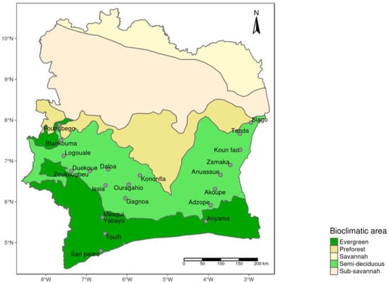 Land use classification used the categories recognized in FAO’s World Census of Agriculture (www.grid.no/climate/ipcc/land_use/045.htm, accessed on 30 November 2023). Bioclimate classification was performed using the Thornthwaite climatogram based on the precipitation effectiveness and temperature efficiency [,], as computed in the CHELSA database [], as follows: humid (Anyama, Adzopé, San Pedro, Touih, Zoukougbeu, Biankouma, Duekoué, Foungbego, Logoualé) and sub-humid (Akoupé, Anuassué, Zamaka, Koun-Fao, Tanda, Siago, Kononfla, Ouragahio, Gagnoa, Meagui, Yabayo, Issia, Daloa). Detailed information about the sampled sites and their geographical positions is reported in Table 1.