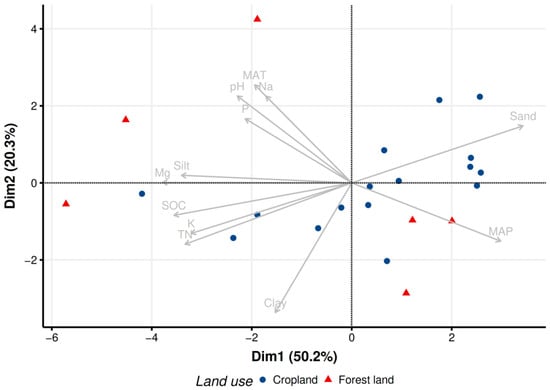 Similarly, soils mapped into the different bioclimates also showed a distinct pattern. Indeed, the soil from the sub-humid area was characterized by higher levels of pH, MAT, Na, P, Mg, silt, SOC, K, TN, and clay, while the soils from the humid area were mostly influenced by MAP and sand percentage (Figure S2).
