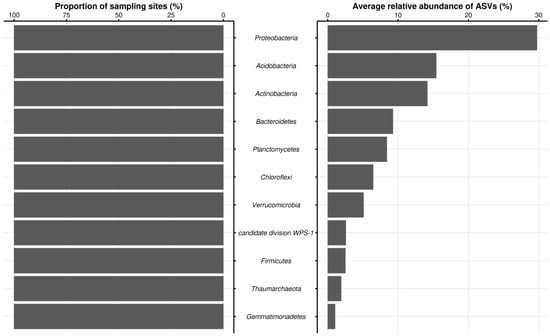 After sequencing, a total of 1,815,112 barcoded sequences were obtained. Following the filtering step, 1,626,802 sequences were retained, resulting in 12,752 amplicon sequence variants (ASVs). A subsequent taxonomic classification revealed that 97.94% of all ASVs belonged to bacteria, while only 2.06% were identified as archaea. The analysis of all ASVs revealed the presence of 43 archaeal and bacterial phyla in total, of which 11 could be considered major taxa based on criteria of a relative abundance of at least 1% and a prevalence of 100%. These major phyla could be divided into two groups, namely major phyla group 1 (relative abundance > 6.47%)—which included Proteobacteria, Acidobacteria, Actinobacteria, Bacteroidetes, Planctomycetes, and Chloroflexi (Figure 3)—and major phyla group 2 (relative abundance > 1.0%)—which included Verrumicrobia, candidate division WPS-1, Firmicutes, Thaumarchaeota, and Gemmatimonadetes (Supplementary Table S1). Specifically, the Proteobacteria phylum was the most abundant group, at 29.8%, followed by Acidobacteria at 15.4%, and Actinobacteria at 14.2%, while Thaumarchaeota represented the only archaeal phylum in this group at 1.93% (Figure 3).