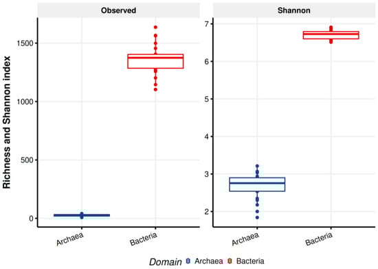 Comparison of indices of richness (observed) and alpha diversity (Shannon) between archaea and bacteria. Upper and lower whiskers of the boxplots extend from the hinge to the largest or smallest value at the most 1.5× interquartile range.