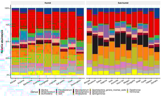 In terms of relative abundance per sampling site of the core microbiome, the analysis showed the dominance of Bradyrhizobium, Rhodoplanes, and Spartobacteria (bacteria), as well as Nitrososphaera (archaea) (Figure 5). However, while the three bacterial genera co-dominate in the humid bioclimate, they are joined by the Nitrososphaera genus in the sub-humid bioclimate. Indeed, Nitrososphaera is very poorly present in soils collected in the humid area, except for the soil of Duekoué. Thus, the presence of the archaeal genus Nitrososphaera could be seen as a signature associated with the sub-humid climatic area in the forest zone of Côte d’Ivoire.