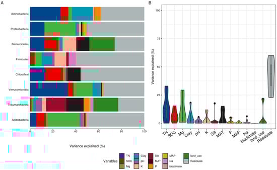 When examining the impact of each environmental parameter, it was observed that the distribution of each major phylum was influenced by three to six parameters. Based on their cumulative influence on major phyla, the drivers can be ranked as follows: total nitrogen (TN) > soil organic carbon (SOC) > magnesium (Mg) > clay > pH > potassium (K). Thus, total nitrogen appeared as the main driver, explaining the diversity variation in six out of eight phyla, closely followed by SOC and Mg. However, land management was also a strong explainer of the diversity variation of Bacteroidetes (21.79%) and Thaumarchaeota (21.72%).