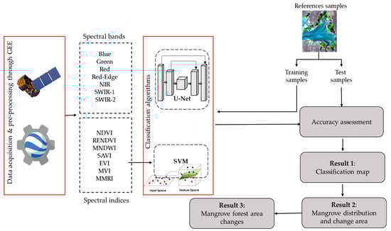 The proposed methodology to detect and map mangrove forests is based on two classification models, SVM and U-Net, and consists of five main steps: (1) data acquisition and pre-processing of Sentinel-2 imagery through Google Earth Engine, (2) training and validation of classification algorithms, (3) evaluating the performance of U-Net and SVM for feature extraction and classification, (4) identifying the most appropriate classification method for mapping mangrove forests, and (5) estimating changes in mangrove coverage. Figure 2 shows an overview of the main stages of the methodology that was used in this research.