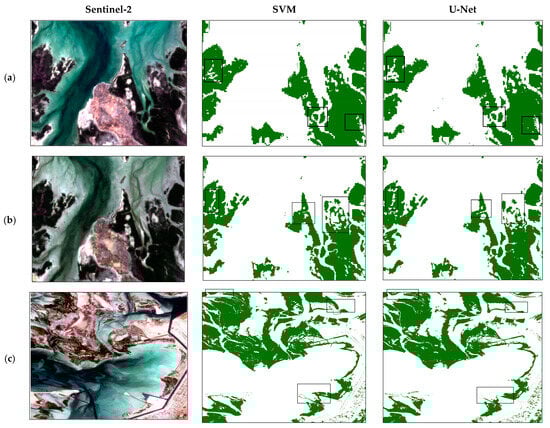 The extraction results of mangroves and non-mangroves using Sentinel-2 image, SVM model, and U-Net model. (a) Madagascar 2015; (b) Madagascar 2019; (c) Abu Dhabi 2015; (d) Abu Dhabi 2020. The black rectangles show a comparison of results obtained from U-Net and SVM classification methods.