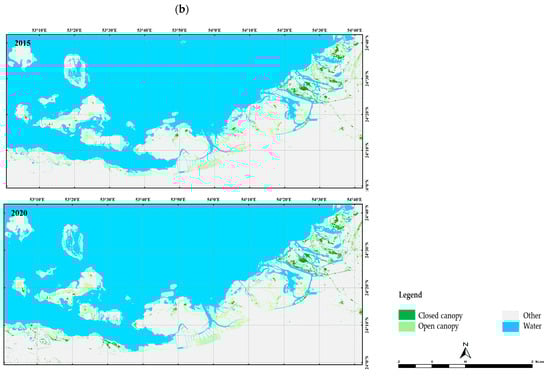 Conversely, the findings from Abu Dhabi indicated a contrasting trend, with a noteworthy increase in the mangrove area observed from 2015 to 2020, accounting for approximately 11% (5857 ha). The classification results reflected a positive shift in the mangrove area during this conservation period, with the total mangrove area being 53,711 ha and 59,268 ha in 2015 and 2020, respectively. In 2015, the closed-canopy area covered 9428 ha and increased by 12,875 ha in 2020, marking a 36.6% positive change. Additionally, the open-canopy area was 43,983 ha in 2015 and increased to 46,393 in 2020, constituting a 5.48% increase.