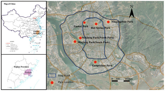 The research site was located in Fuzhou City, Fujian Province, China. The green coverage rate of the built-up area is 44.92%, the green space rate is 41.69%, and the city’s per capita park green space area is 14.9 square metres per person. Urban parks are the most important UGSs in Fuzhou. These parks are mainly built for the public, and at the same time, they play a role in urban ecosystem protection and biodiversity enhancement. As a research object, they were chosen based on the following criteria: First, they are parks that have existed for a long time and were built on a large scale during the urban development process in Fuzhou. Second, the parks have large flows of people and different vegetation and are of different types. In addition, they have obvious characteristics in terms of geographical location, spatial type, morphological type and urban development function. Six parks in the main urban area of Fuzhou were selected as comparative research objects (Figure 1): Zuohai Park, Hot Spring Park, Niugangshan Park, Gaogaishan Park, Minjiang Park (North Park), and Minjiang Park (South Park). Norman K. Booth [51] divided plant spaces into five basic types: open spaces, semi-open spaces, covering spaces, perpendicular spaces, and enclosed spaces (Table 1). After the field survey, survey samples of five spatial types were selected in each park. In these 30 research plots, field surveys and soundscape status recordings were carried out, and the classification of sound sources was carried out in combination with the classification methods provided by Liu Jiang [30,46] and other researchers. As geophysical sounds such as wind and rain sounds were not present in each plot, they could not be compared, so they were excluded, and in the actual investigation, a sunny, windless, and rainless weather period was selected. Finally, three typical sound sources were identified: biological sound, human sound, and mechanical sound (Table 2).