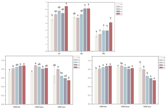 In this study, one-way ANOVA was used to analyse the differences in sound source perception and overall soundscape perception in different types of plant spaces, and the results are shown in Table 3. Sound source perception showed highly significant differences in different types of plant spaces, including SDD-bio (p < 0.001), SDD-hum (p < 0.001), SDD-mec (p < 0.001), SHD-bio (p < 0.001), SHD-hum (p < 0.001), and SHD-mec (p < 0.001).