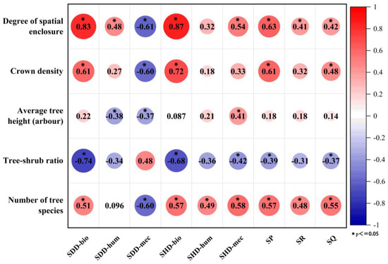 Plot of correlation coefficients between plant space and soundscape perception. The colours on the right side represent the coefficient score of the pairwise correlation between plant spatial factors and soundscape perception: the deeper the colour, the greater the coefficient value and the stronger the correlation. Red is positively correlated, blue is negatively correlated, and p ≤ 0.05 indicates a significant correlation.