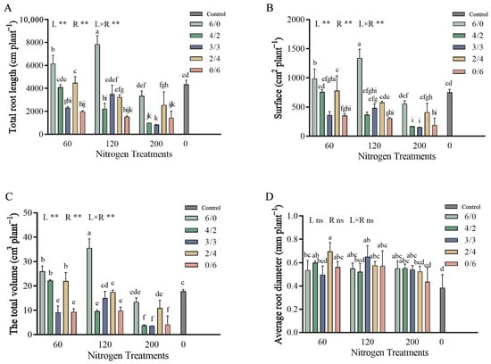 Root traits of S. linearistipularis under different N treatments. Note: All data were analyzed using two-way analysis of variance (ANOVA) followed by Duncan’s test for comparison with the controls. N levels are denoted as “L”, the N ratio as “R”, and the interactive effect of N levels and ratios as “L × R”. Different superscript lowercase letters indicate significant differences among the treatments at p < 0.05 in specific tissues. Data represent means ± SD (n = 4), “ns” denotes non-significance and double asterisks (**) represent significant differences at p < 0.01.