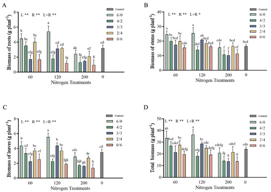 Biomass of S. linearistipularis. Note: All data were analyzed using two-way analysis of variance (ANOVA) followed by Duncan’s test for comparison with the controls. N levels are denoted as “L”, the N ratio as “R”, and the interactive effect of N levels and ratios as “L × R”. Different superscript lowercase letters indicate significant differences among the treatments at p < 0.05 in specific tissues. Data represent means ± SD (n = 4), a single asterisk (*) represents significant differences at p < 0.05, and double asterisks (**) represent significant differences at p < 0.01.