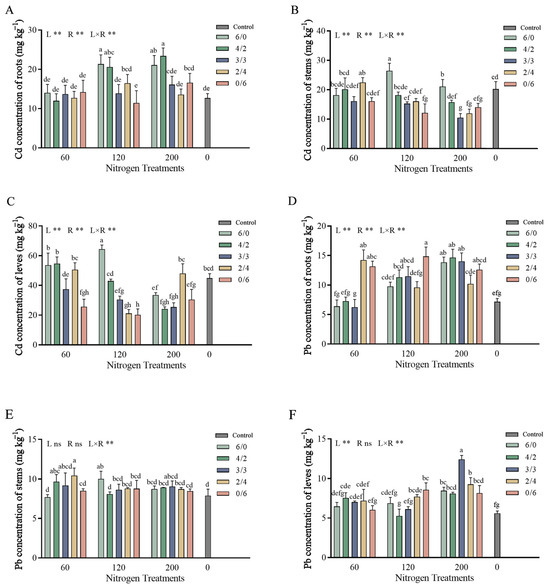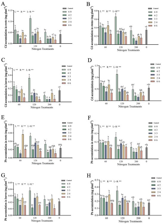 Pb and Cd accumulation in S. linearistipularis under different treatments. Note: All data were analyzed using two-way analysis of variance (ANOVA) followed by Duncan’s test for comparison with the controls. N levels are denoted as “L”, the N ratio as “R”, and the interactive effect of N levels and ratios as “L × R”. Different superscript lowercase letters indicate significant differences among the treatments at p < 0.05 in specific tissues. Data represent means ± SD (n = 4), a single asterisk (*) represents significant differences at p < 0.05, and double asterisks (**) represent significant differences at p < 0.01.