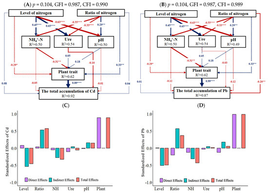 A structural equation model was employed to illustrate the direct and indirect effects of N application, soil properties (NH4+-N, Ure, and pH), and plant traits on the total accumulation of Cd (A) and Pb (B) in S. linearistipularis, along with the effect value of the total Cd accumulation (C) and Pb accumulation (D). Solid black and red arrows indicate significantly positive and negative correlations, respectively, while dotted arrows indicate insignificant correlations. The numbers adjacent to the arrows represent standardized path coefficients (λ). Significance levels are denoted as * p < 0.05, ** p < 0.01, *** p < 0.001.