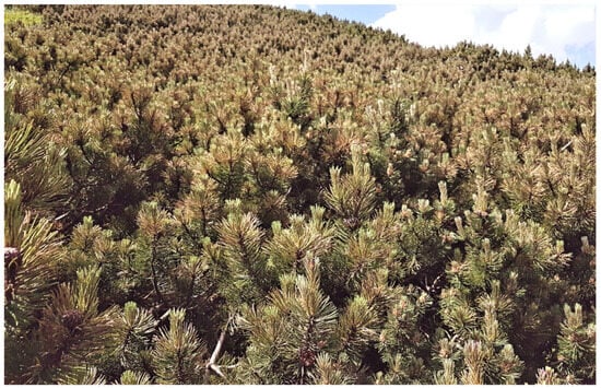 The dwarf mountain pine (Pinus mugo Turra) mainly grows as a shrub adapted to various rocky habitats in the high-altitude mountains, including the Alps, Pyrenees, Carpathians, and Balkans [1]. It shows a high capacity for vegetative reproduction and is characterized by a large morphological diversity [2,3]. A related species found in the Pyrenees and Western Alps is distinguished as a separate taxon, P. uncinata, which develops a 12–20 m high tree form [2,4]. In the Tatra Mountains (southern Poland), P. mugo forms compact groups of shrubs mainly above the montane forest zone, ca. 1.550–1.850 m a.s.l. [3,5].