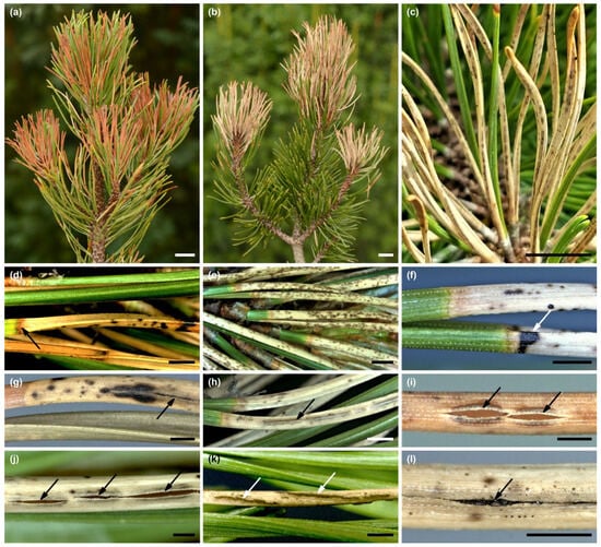 Symptoms on needles of Pinus mugo and etiological signs of Lophodermella sulcigena (a) reddish-brown current year needles (August 2017), (b) partly white-gray discolored previous year needles (May 2016), (c) hysterothecia on white-gray needles (July 2016), (d) red-brown band between living and dead parts of the needle (arrow), (e) numerous dark spots on dead distal parts of the needles, (f) black transverse stripe on dead part (arrow), (g) hysterothecium developed within dark spot (arrow), (h–j) hysterothecia: in dry condition (arrow) (h), in humid conditions (arrows) (i), after ejecting most of the ascospores (arrows) (j), (k,l) secondary fungi in/on hysterothecia: Cladosporium herbarum conidiophores and conidia (arrows) (k), Epicoccum nigrum sporodochia (arrow) (l). Scale bars: (a–c) = 1 cm, (d,e) = 0.2 cm, (f,g) = 0.1 cm, (h) = 0.2 cm, (i,j) = 0.1 cm, (k) = 0.2 cm, (l) = 0.1 cm.