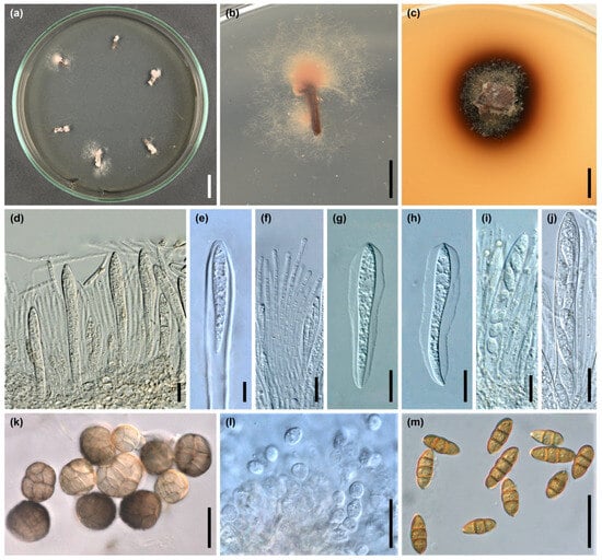 Colonies and microstructures of Lophodermella sulcigena and secondary fungi: (a) colonies growing from needle fragments (8 weeks, MEA, 20 °C), (b) reverse of two colonies, (c) 10-week old subculture on MEA, (d–j)—microstructures of L. sulcigena: fragment of hymenium with asci and paraphyses (d), ascus with one unejected ascospore (e), paraphyses (f), ascospores with gelatinous sheath (g,h), ascus with six unusually shaped ascospores (i), ascus with eight unusually shaped ascospores (j), (k,l)—secondary fungi in hysterothecia of L. sulcigena: Epicoccum nigrum conidia (k), Seuratia millardetii asexual stage, conidia and torulose cells in gelatinous matrix (l), Hendersonia sp. conidia (m). Scale bars: (a–c) = 1 cm, (d) = 20 µm, (e) = 10 µm, (f) = 20 µm, (g,h) = 10 µm, (i–m) = 20 µm.