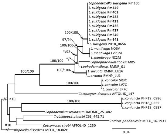 - Ata, J.P.; Burns, K.S.; Marchetti, S.; Munck, I.A.; Beenken, L.; Worrall, J.J.; Stewart, J.E. Molecular characterization and phylogenetic analyses of Lophodermella needle pathogens (Rhytismataceae) on Pinus species in the USA and Europe. PeerJ 2021, 9, e11435. [Google Scholar] [CrossRef] [PubMed]