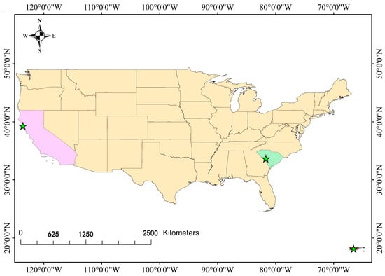 Location of three study areas in the USA (The pentagram marks the specific location of the study area).
