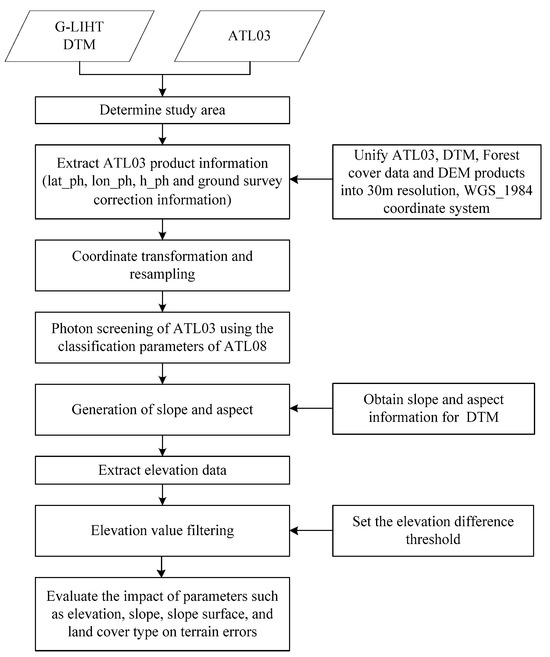 The technical route in this paper can be summarized into three main components, as illustrated in Figure 2. The first part involves processing ICESat-2/ATLAS data by removing a significant portion of low-precision data points to enhance overall accuracy. The second part utilizes G-LiHT DTM data as validation, comparing ICESat-2/ATLAS ATL03 with three other DEM products (ASTER DEM, SRTM DEM, and the GLO-30 DEM) as understory terrain data, assessing differences and similarities among datasets. The third part conducts a detailed analysis of factors such as slope, aspect, and forest cover types, examining their influence on the performance of the four elevation datasets as understory topography products. In summary, the technical approach encompasses data processing, comparative analysis using G-LiHT DTM, and a detailed assessment of the impact of terrain features on the accuracy of elevation datasets. These three components constitute the core of the research methodology presented in the paper.