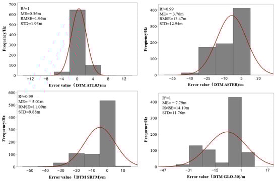 Histogram of the error distribution of the four DEM species (The red line represents the error curve).