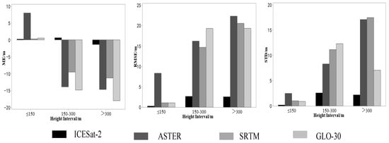 To analyze the relationship between ground altitude and DEM errors, and due to the limited availability of study data, the DEM errors are categorized into three elevation ranges: 0–150 m, 150–300 m, and >300 m. Figure 4 displays the ME, RMSE, and STD values of different DEM products within these elevation ranges.