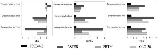 This study utilizes the GLC_FCS30-2020 product as a reference for the forest cover data. Based on the distribution of G-LiHT reference data within the selected study area, three vegetation cover types were identified: closed evergreen needleleaf forest, closed evergreen broadleaf forest, and closed mixed forest. Figure 5 presents the ME, RMSE, and STD error values for four sets of DEM data under different forest types.