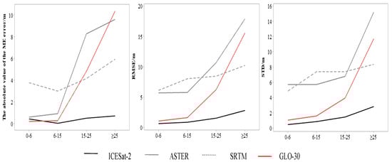 This study further quantitatively analyzed the variation of elevation errors with slope by resampling and categorizing the slope of the study area into four categories: (0°, 6°], (6°, 15°], (15°, 25°], and >25°. To provide a more intuitive representation of the accuracy of DEM data under different slope levels, trends of the absolute values of ME errors, RMSE errors, and STD errors of the four DEM products are plotted against slope variation, as shown in Figure 6.