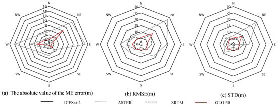 To analyze the accuracy of DEM data under different aspects, the DEM-derived aspects were divided into eight categories: (337.5°, 22.5°], (22.5°, 67.5°], (67.5°, 112.5°], (112.5°, 157.5°], (157.5°, 202.5°], (202.5°, 247.5°], (247.5°, 292.5°], and (292.5°, 337.5°]. By referring to Figure 7, one can visually observe the performance of the four DEM data sets under different aspects.