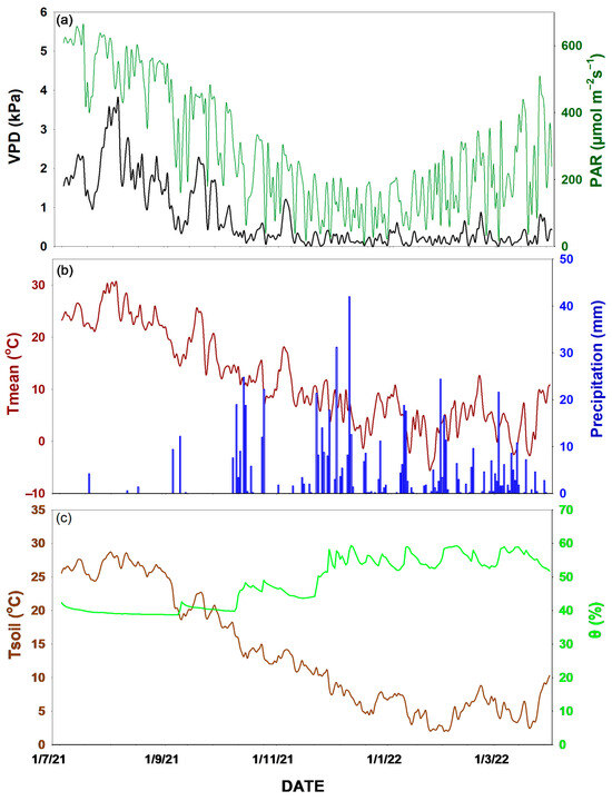Daily values of: (a) vapor pressure deficit (VPD) and photosynthetically active radiation (PAR), (b) mean air temperature (Tmean) and precipitation, and (c) soil temperature (Tsoil) and soil water content (θ) at 15 cm depth.