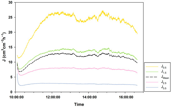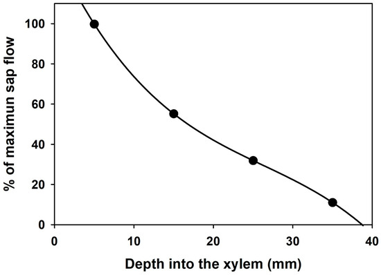 Sap flux densities were found to be higher in the outer xylem compared to the inner xylem and the mean sap flux density (Jmean) occurred slightly deeper than 1.5 cm from the cambium (Figure 2). Maximum sap flux densities were observed at a depth of approximately 0.5 cm from the cambium, while values declined towards a depth of 3.5 cm (Figure 3). Maximum Js were 27.29 cm3 cm−2 h−1 and 14.79 cm3 cm−2 h−1 at the measurement depths of 5 and 15 mm beyond the cambium, respectively. The maximum Js in the two innermost depths (25 and 35 mm) was 10.03 cm3 cm−2 h−1 and 6.14 cm3 cm−2 h−1, respectively.