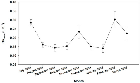 Mean monthly values of sap flow per conducting sapwood area Qsmean [L h−1] measured from July 2021 until March 2022. n = 5 trees ± SE.