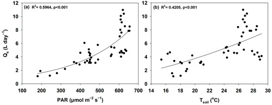 Relationships between Qs [L day−1] and (a) photosynthetically active radiation (PAR), and (b) mean soil temperature (Tsoil) at 8 cm depth during the dry months of the study period (July to September 2021).