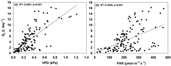 Relationships between Qs [L day−1] and (a) vapor pressure deficit (VPD), and (b) photosynthetically active radiation (PAR) during the wetter months of the study period (October 2021 to March 2022).