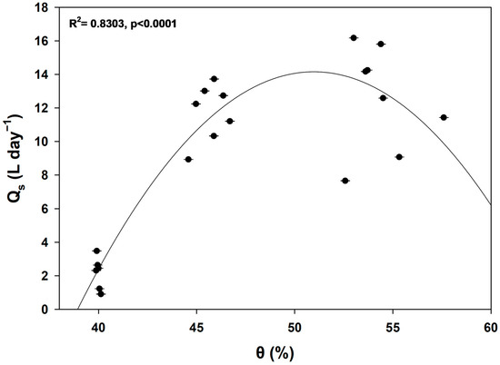 The relationship between Qs [L day−1] and soil water content (θ) during the wetter months of the study period (October 2021 to March 2022) is shown by the nonlinear regression model when VPD > 0.5 kPa). Symbols indicate mean daily values, and error bars indicate SE (n = 5 trees).