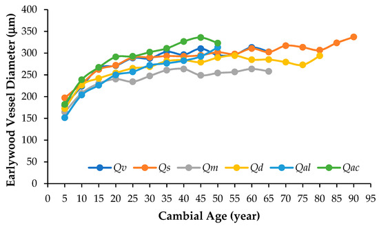 Radial variation of earlywood vessel diameter in Qv, Qs, Qm, Qd, Qal, and Qac.