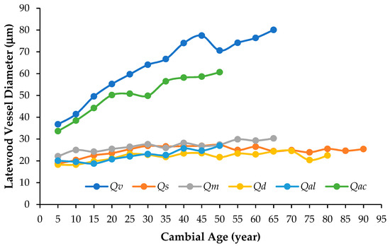 Radial variation of latewood vessel diameter in Qv, Qs, Qm, Qd, Qal, and Qac.