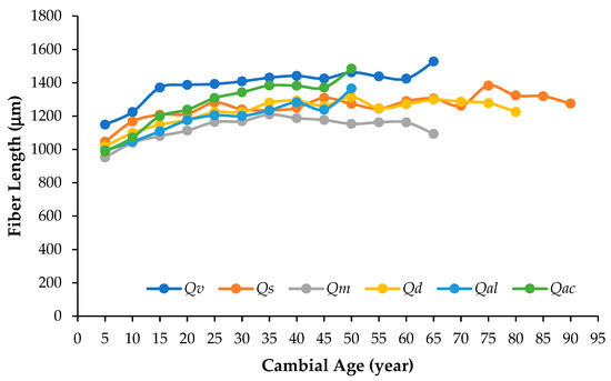 Figure 3 shows the radial variations in fiber length among the six Korean oak species. All species exhibited a similar pattern, rapidly increasing from the pith and remaining constant with a slight increase or decrease after 30–40 years of growth rings. The radial variation pattern of fiber length in our study is consistent with those in previous studies on Quercus spp. [32,33,34,35]. The authors mentioned that the fiber length of Quercus spp. showed a rapid increase from pith until 10–20 growth rings and a slight increase or constancy until near bark.