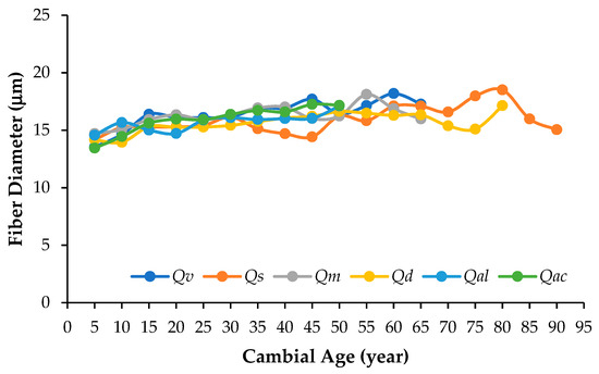 The widest fiber diameter in both juvenile and mature wood was observed in Qv with 15.8 μm and 17.2 μm, respectively, whereas the narrowest values were observed in Qd for juvenile wood with 14.9 μm and Qs for mature wood with 15.9 μm. In line with the juvenile and mature wood results, Qv exhibited the widest fibers at 16.4 μm, whereas Qd displayed the narrowest fibers at 15.6 μm. There was a significant difference in fiber diameter between the species, except between Qv and Qm, as well as between Qd, Qs, and Qal.